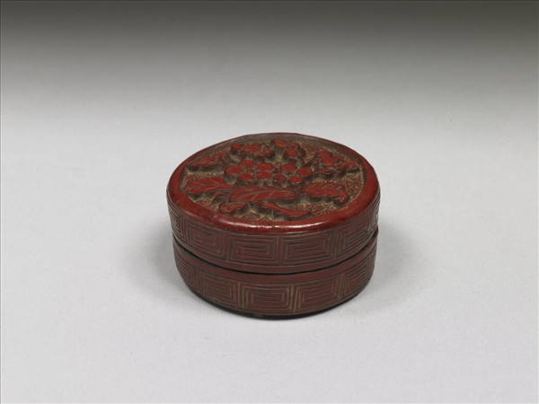 剔紅小盒,色豔紅沉鬱。子母口,淺直壁,平底。蓋面雕飾連枝山茶花與葉,斜方朵花錦地,漆層肥厚,花朵枝葉刀鑿簡單生動。器裡與底髹黑色光漆。