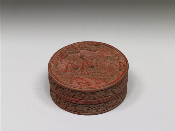 剔紅小盒,色紅。子母口,淺直壁,平底。蓋面雕飾林水邊持蓮蓬仕女,後有捧瓶侍女,並雕天水地紋錦地,器與蓋側面滿飾番蓮花紋。器裡與底髹黑色光漆。