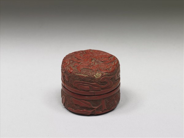 剔紅小盒,色硃紅,器身有傷損。子母口,淺直壁,平底。蓋面雕一獅,其後有蕃人側身飛起作降獅狀,姿態甚異,器身與底雕荔枝,皆以斜方朵花錦為地。器與蓋內髹黑色光漆。