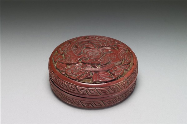 剔紅圓盒,色紅,漆層有裂傷。子母口,淺直壁,平底。蓋面雕飾連枝牡丹花葉,當中穿梭鳳鳥一對,器與蓋側面各雕回紋一周,本件漆層肥厚,刀法深圓。器裡與底髹黑色光漆。