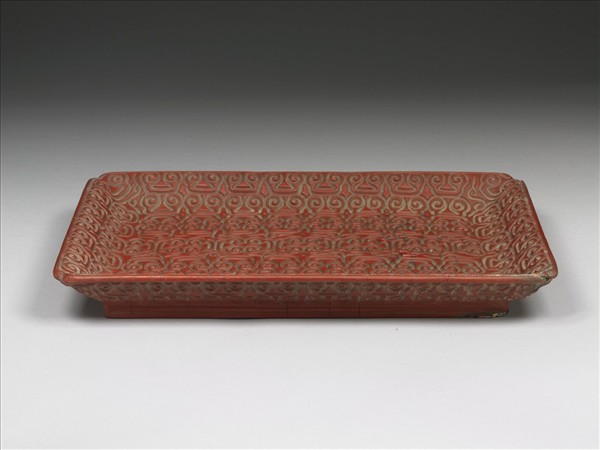 剔紅盤,色硃紅。長方形盤,四角內委,侈口,淺壁,圈足。通體雕飾對稱勻整的雲鉤紋,此類雲紋線條雕刻又稱「雲雕」,本件入刀頗深,但線條渾圓。器底髹黑色光漆。