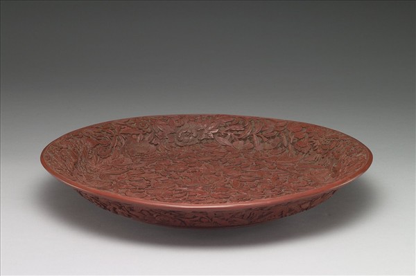 大盤口沿外侈,盤心大,圈足,足內髹黑漆。盤底自足沿向盤沿生長出數不清的各式花卉:海棠、牡丹、菊花、梅花等,斜向交錯,令人眼花撩亂。盤面則自向盤沿向盤心伸展出無數的花卉,牡丹居圓心,圖案下層飾錦地,漆地亦為紅漆,加深盤面平面化的視覺效果,花卉各具姿態,生動靈活,漆質澀,漆層薄,刀鋒銳利,不重打磨,刻意突顯熟練的工藝技術。