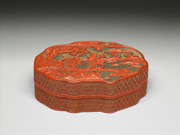 橢圓不規則形盒,平底無足,子母口,盒底及盒內髹黑漆,盒面邊緣加框,盒側剔紅六角花式錦地,盒面剔彩由底而上為黃、綠、紅三色。各色各形錦地之地,一採花仕女居畫面中央,行於水上的獨木橋上,手持牡丹,後面跟著一女僕背負一簍花物。遠方散佈著長著牡丹的小山。漆色紅,刀痕明顯,用刀流暢,做工規整。