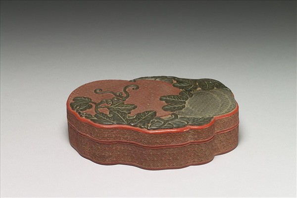 瓜式盒。蓋面瓜瓞紋,一瓜赭色,一瓜綠色,內飾菱格萬字錦紋,搭配綠色枝葉,襯以黃色菱格回紋,有「子孫萬代」之吉祥寓意;周壁雕繡球朵花錦紋。內塗黑漆。