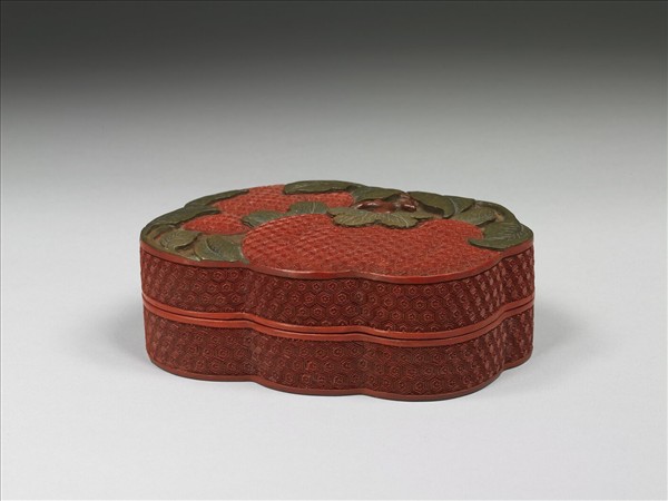 雙柿形盒。蓋面剔彩雙柿,內雕飾菱格朵花錦紋,綠葉紅枝底下,有土黃色菱格回紋;周壁雕六方朵花錦紋。內塗黑漆。