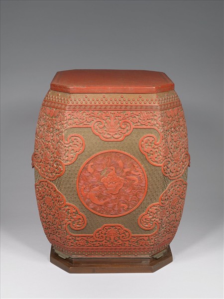 雕漆繡墩,通體雕紅、棕色漆,似木胎。八角形,平面,腹微碩,中空,平底,有銅質如意足四。腹上下兩端有鼓釘紋、回紋各一道,腹壁滿雕朵花錦地,四闊面中心各有開光一處,內雕獨角雲龍,其中二龍為浮雕,以作搬手。另四面相連雕飾雲頭,內滿雕番蓮花,花紋上下相對襯,墩面滿刻萬字錦地。底髹黑色光漆。墩下加裝銅圈。