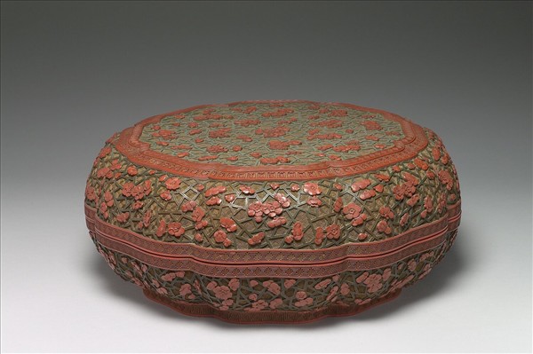 雕漆圓盒,通體雕紅、綠、深淺棕色漆,似木胎。八瓣形,子母口,弧形壁,圈足。蓋與器身滿雕梅花及多角幾何紋圖案,形成冰梅紋,襯以斜方朵花錦地,蓋面與口沿分飾回紋、蓮瓣紋。器底與裡髹黑色光漆,內附髹漆淺盤,上有繪暗八仙八瓣形盤。
