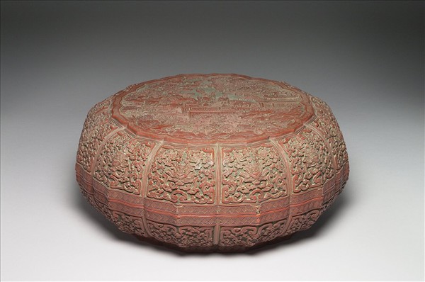 十二瓣花形盒,器側壁皆雕番蓮紋,器內及底足為黑漆描金團花,外底足內則描金梅花、草葉與蝴蝶為飾。蓋面以回紋圍成花形開光,開光內雕亭臺人物為飾,一女子站於高台,後有兩女與二鹿跟隨,亭下有水,周圍山石、流雲、松木圍繞,似表現仙境景象。