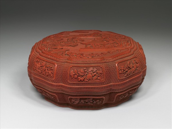 瓣式盒,器內及底髹黑漆,盒側錦地開光,內雕花卉紋,盒蓋描寫山水間玩耍的兒童,構圖和宮中繪製的十二月令圖相近。