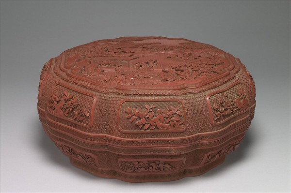 八瓣盒,底有八瓣形矮足。外髹朱漆,內和底塗黑漆。蓋面雕嬰戲圖,外加回紋、變形蓮瓣紋各一周,蓋、盒周壁各做八開光,內雕山石花卉,空隙處雕斜方回紋,外雕六角朵花錦紋,口沿上下有回紋兩道。
