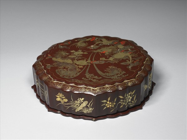 褐漆地描金,盒蓋飛龍和岩石上棲息的鳳相對,金漆之外,點綴銀、紅漆,盒側花卉,盒內灑金。