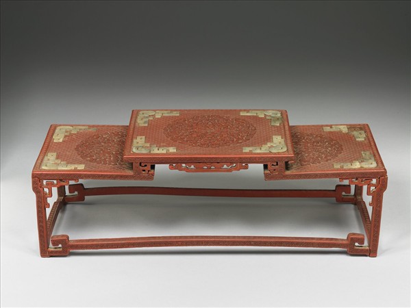 剔紅几座,色深紅,似木胎,身有傷缺斷裂。長方形几,四足,面以高低三個正方形構成,形如凸字,面以回紋錦作地,中飾團花,八個邊角各嵌雲紋青玉一組,其一已失,面下折角鏤雕回紋與雲紋,面周邊與腿柱均飾回紋。几裡髹黑色光漆。