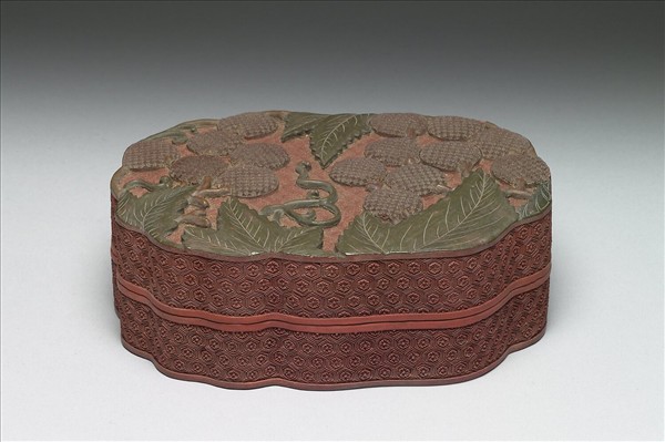 雕漆盒,紅、綠、紫、深棕四色漆,似木胎,邊角有傷缺。不規則長橢圓形,平頂蓋,矮直壁,平底。蓋面雕四彩折枝葡萄二束,共有果實十五枚,間飾藤蔓枝葉,熱鬧討喜。蓋與器周壁雕六角形朵花錦地。器裡與底髹黑色光漆。