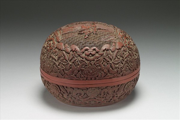 剔紅盒,色深紅,似木胎。桃形盒,子母口,深弧壁,平底。蓋面雕八仙之李鐵拐,蓬髮捲髯,寬袖袍,左手拄杖,右手托葫蘆,神態輕鬆傳神,二側桃柳並茂,襯以遠山流雲,更顯春景宜人。器與蓋周壁滿雕纏枝牡丹,間飾有蝙蝠與雲頭紋。器裡與底髹黑色光漆。