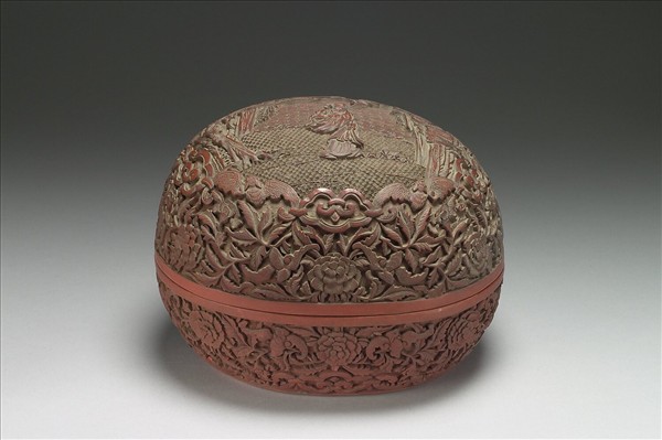 剔紅盒,色深紅,似木胎。桃形盒,子母口,深弧壁,平底。蓋面雕八仙之何仙姑,著長服裙,腰佩環飾,雙手執荷花一莖,作回顧狀,秀麗婉約,兩旁峰壁樹石,上有流雲環繞。器與蓋周壁滿雕纏枝牡丹,間飾有蝙蝠與雲頭紋。器裡與底髹黑色光漆。