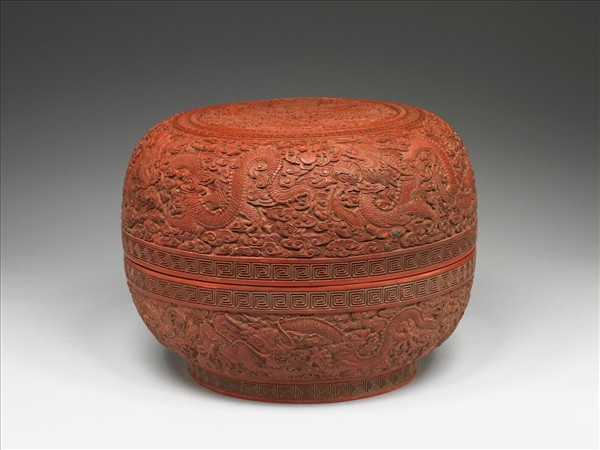 剔紅圓盒,色硃紅,鮮豔有光澤,口緣漆層傷缺。圓形盒,直口,深壁,圈足。全器雕飾水波紋錦地與雲紋,九龍穿梭其間,一龍盤踞蓋面開光,其餘或相戲,或弄珠,姿態各異,生動威武。器裡與底髹黑色光漆,器內有填金楷款「大清乾隆年製」,蓋內則書「九龍寶盒」。