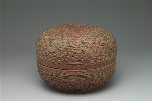 剔紅圓盒,色暗紅,漆層略有傷缺,並有補漆數處。圓形盒,直口,深壁,圈足。全器雕飾水波紋錦地與雲紋,九龍穿梭其間,一龍盤踞蓋面開光,其餘或相戲,或弄珠,姿態各異,生動威武。器裡與底髹黑色光漆,器底有填金楷款「大清乾隆年製」,蓋內則書「九龍寶盒」。