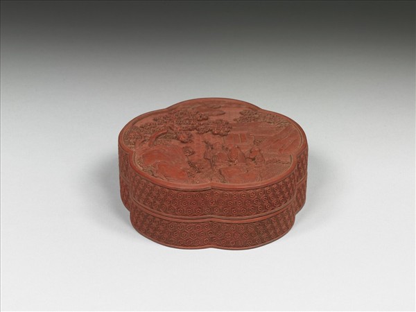 五瓣花式盒,外髹朱漆,內塗黑漆。蓋面剔紅古木茅舍,兩老並立閒話,童子旁侍,襯以平行回紋、波濤紋、菱格萬字錦紋。盒壁雕六角朵花紋。