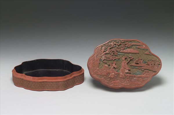 雕漆小盒,紅、綠、黃色漆。不規則橢圓形盒,子母口,淺直壁,平底。蓋面雕採花仕女,一人手持花卉一枝,另一背小花籃跟隨其後,襯以松竹野卉,器與蓋側雕飾六方朵花錦地。器裡與底髹黑色光漆。