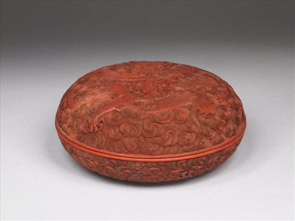 剔紅小盒,色紅。子母口,弧形淺壁,平底。器與蓋面上各雕正面戲珠盤龍一,隙地則滿雕翻湧的雲氣紋。器內髹黑色光漆。