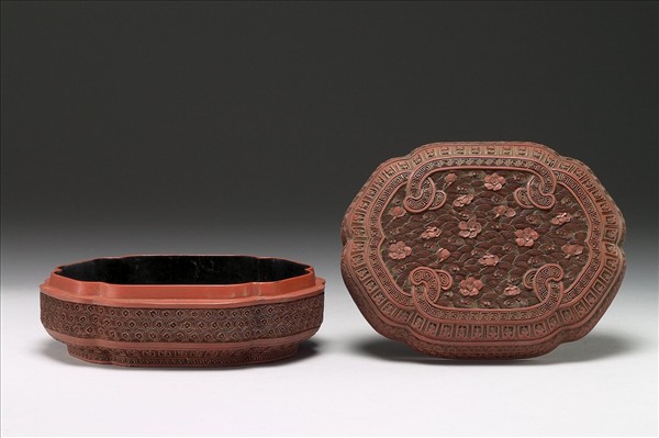 雕漆小盒,色暗紅。六瓣式橢圓形盒,子母口,弧形壁,圈足。蓋面滿雕水波紋,上層浮梅花數朵,其周與圈足皆飾回紋與蓮瓣紋,蓋與器側面則雕六方朵花錦地。器內與底髹黑色光漆。