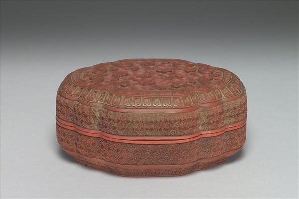 雕漆小盒,色暗紅。八瓣式橢圓形盒,子母口,弧形壁,圈足。蓋面滿雕水波紋,上沈浮梅花數朵,其周與圈足皆飾回紋與蓮瓣紋,蓋與器側面則雕六方朵花錦地。器內與底髹黑色光漆。