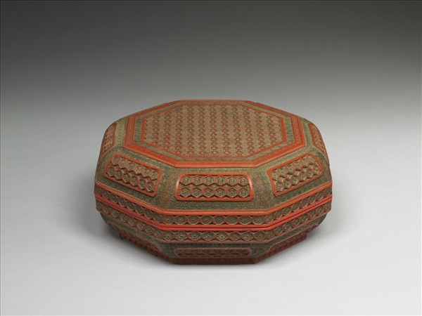 雕漆盒,紅、黃與綠色漆。八角形盒,子母口,弧形壁,圈足。盒面雕紅漆八角形紋,紋內各有綠漆菊花一朵。八角形紋相接處,形成之方形內飾赭色「卍」字。盒周每面開光內雕六方朵花錦間斜方卍字,餘作六方朵花錦地,底裡均漆黑光。
