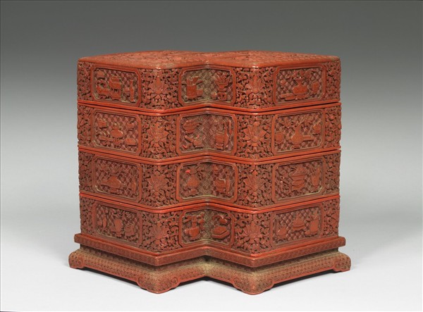 器作方勝形,器表髹紅色漆,口與壁垂直,平底附漆座。分作三層,每層皆有六個方形委角開光,內有爐、瓶、盒等雜項博古圖樣,開光外則以花葉紋滿飾。器蓋以龍紋為飾。由於各層與器蓋皆以子母口相接疊,故器蓋闔上後,全器形如一四層方勝盒。