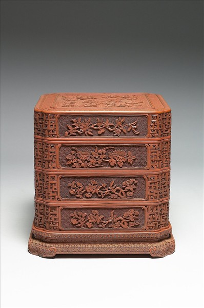 委角正方形盒,器表髹紅色漆,口與壁垂直,平底附漆座。分作三層,每層皆有四個方形委角開光,內雕漆折枝花為飾。器蓋周飾回紋一圈,蓋面上方形委角開光,開光中剔雕折枝花五,皆作盛開綻放之貌。由於各層與器蓋皆以子母口相接疊,故器蓋闔上後,全器形如一四層方盒。