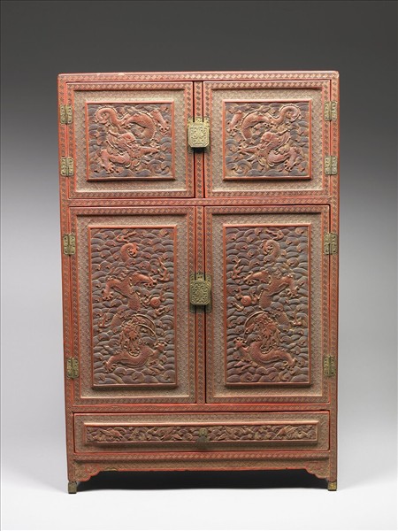 剔紅長方形立式小櫃,分三層,上與中層為對開式門,嵌銅軸片與飾件。櫃中層較大,中層內上方設有暗屜。下層作抽屜,底有四如意形足,櫃面、頂面與兩側有多個開光,皆雕龍戲珠紋,飾以波濤,外襯繡球朵花錦地,屜面雕波濤紋與魚龍。邊界均飾回紋,器裡與底髹黑色光漆。
