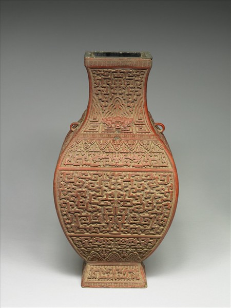 剔紅方瓶,色紅,漆層略有傷損。方形瓶,撇口,收頸,豐肩,四小耳,二耳已傷脫,碩腹向下斂收,方形圈足。全器以棱脊分為四面,每面以回紋錦地與線條方折的拐子龍為飾,肩部上下各雕蟬紋一周,上有獅首一,小耳在獅嘴位置,若銜環狀。口緣鑲金屬圈。
