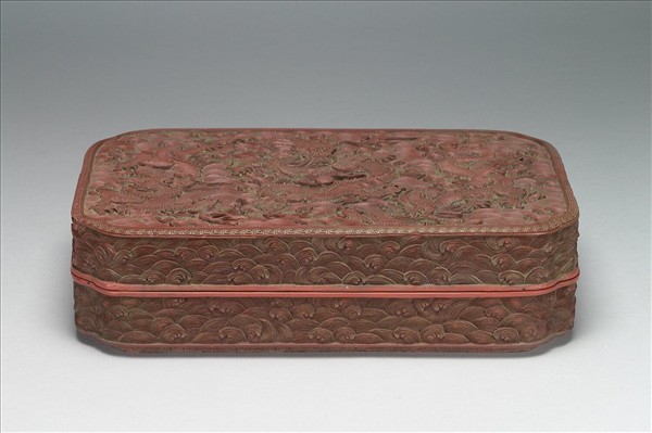 剔紅長方盒,色硃紅,漆層略有剝落。長方形,邊角內委,子母口,直壁,圈足極淺。全器雕滿波濤水紋,蓋面於波濤之上雕飾三龍戲珠,鱗爪精細,姿態威武,並以回紋為邊。器裡與底髹黑色光漆,蓋內有填金楷款「雲龍寶盒」,底則書「大清乾隆年製」。