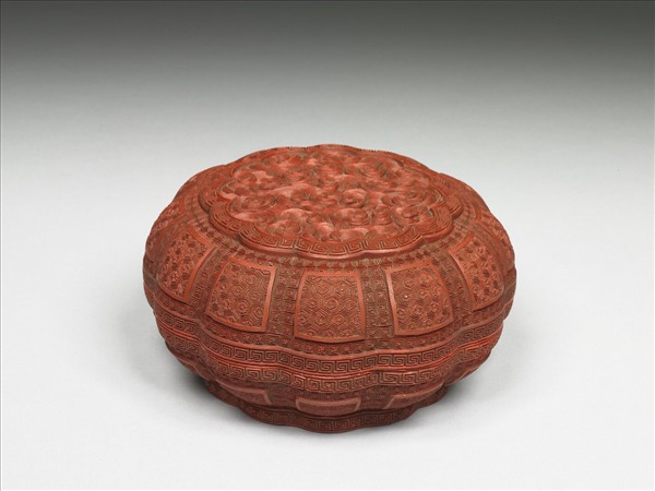 剔紅圓盒,色硃紅,鮮艷有光澤。十二瓣造型圓盒,子母口,深壁,圈足。蓋面雕雲紋,雲左旋成圓渦狀,線條動感富層次,蓋與身側皆開十二個開光,內雕六角形朵花錦地,開光外餘地咸飾正方卍字錦。器裡與底髹黑色光漆,蓋內有填金楷款「蟠雲寶盒」,底則書「大清乾隆年製」。