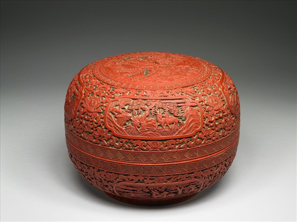 雕漆捧盒,通體雕紅、黃、綠色漆,色彩光艷。圓形盒,子母口,深弧壁,圈足。蓋面雕清幽異境裡,八仙上謁仙翁,眾神眉目衣飾細膩,個性特徵明顯,蓋與器側面各有四個開光,雕山林瑞獸,餘地飾番蓮花葉。器底與器內髹黑色光漆,盒內並繪多種描金花葉紋,器底作填金楷款「大清乾隆年製」。