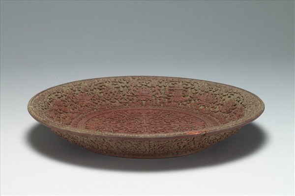 盤,圈足。盤內外髹朱漆,圈足塗黑漆。盤中心有一渦旋紋,包圍以直角雲紋以及蝙蝠四,外加回紋、變形蓮瓣紋各一周,其外雕八寶紋及番蓮紋,襯以回紋錦地,口沿一道折帶紋;外壁剔紅番蓮紋。圈足底有「大清乾隆年製」六字楷款。