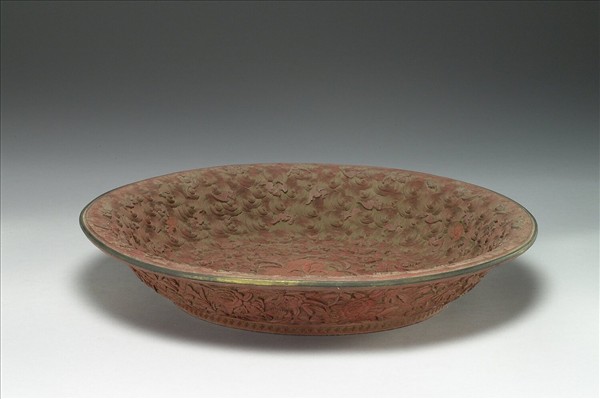 圓盤,侈口,圈足。器內外髹朱漆,口沿塗金色,圈足塗黑色。盤心剔紅三桃實,桃內填以六方朵花紋,其餘雕波濤紋及蝙蝠,象徵「福壽」之吉祥寓意。外壁雕番蓮紋。底有「大清乾隆年製」六字楷款。