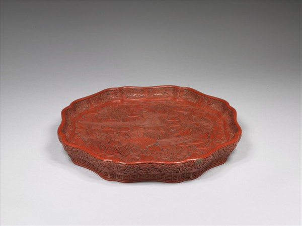 八瓣式盤,盤沿高,低台足,足內髹黑漆,盤底清宮黃籤墨書:「頭等/宣德明款此樣四件」。盤沿內外雕連枝牡丹,足側面雕方形回字紋,盤心為鸚鵡牡丹,枝葉繞盤,花朵亦沿盤安排了四大一小,中心另外一朵為鳥的翅膀遮蓋,一隻鸚鵡張翅飛舞,另一隻頭向下看,似欲降落。鳥形身軀扁圓,羽毛排列整齊,姿態僵硬。胎厚,漆層薄,佈局密,刀法純熟,漆色紅偏黃,花瓣與葉片平鋪直敘,少重疊,少翻轉,漆面平,少起伏。從花卉、鳥的安排及漆質、用刀等方面考慮,當為清代乾隆朝之前的作品。