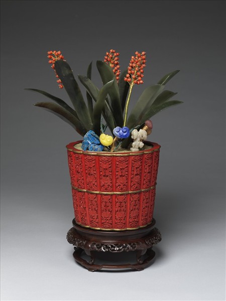 萬年青是中國本土栽種歷史久遠的常綠草本植物。由於冬夏長青,具有兆吉的祥瑞寓意。民間婚聘禮俗中,取之與吉祥草等植物結采作為納福之象徵。明中期以來,其傲風霜的質性,為文士所重,遂逐漸成為室內清供之一。此件像生式盆景,以紅色帶金箍菊瓣紋雕漆盆,盛裝葉片修長的碧玉萬年青,及金絲穿綴的紅色果實。盆內尚有青金石、碧璽與不透明玻璃製成的奇石靈芝,色澤華美。檔案記錄顯示清代宮廷曾收貯各式絹花、玉石萬年青,用之於歲朝年節陳設,或四時清供。乾隆皇帝於戊戌年(四十三年,1778)為明陳栝所繪《萬年青》題識中,道出諧音「萬年清」所寓「保民萬年」的意涵。在清宮眾多吉祥陳設中,萬年青盆景以其長青不凋的意象,傳達萬載清平,安康永續的祝願。