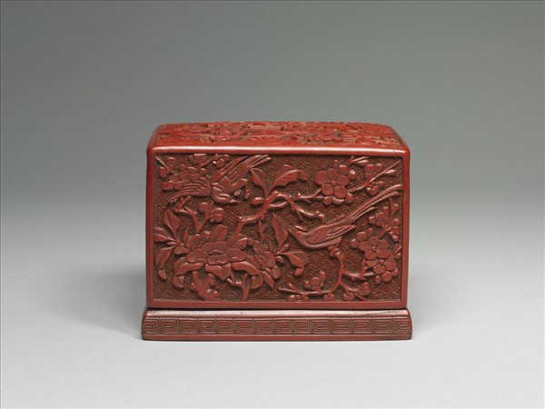 長方形套盒,盒身內外髹黑漆,盒底側面為回紋,盒內清宮以木盒盛裝小玉器十件及書畫小冊頁。盒蓋側面四面為花鳥圖,盒蓋為山水人物。長邊的花鳥圖二面略為不同,以梅幹為主,自偏左位置伸出枝幹,再轉向右橫向伸展,茶花安排在畫面偏下方,中央兩隻長尾鳥回首相對,空間中散佈著全開的梅花。短邊的花鳥圖,枝幹在畫面中央一鳥,低首或昂首。整體構圖平均,鳥的眼神兇猛,花、葉及鳥的身形描寫僵硬,花鳥圖的底層滿鋪錦地。盒蓋上方為山水人物,前景偏下方一地平線斜向分割畫面,三人展卷觀看,左後方崖壁聳立,高松橫臥,右後方遠處則山石層疊,壓縮遠處空間,物象底滿飾錦地。漆色紅,刀法銳利,打磨不多,岩石紋理遺留刀痕。