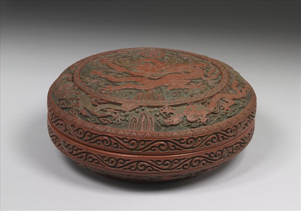 圓盒,拱頂,圈足,盒內清宮加一木製淺承盤,盒內、盒底髹黑漆。盒身飾龍行山水之間,龍身一黃一紅相間,一昂首一回首,龍紋之下為連續回紋,之上為連續花形三角錦地,再上為唐草紋。盒蓋分內外兩圈,兩圈之間雕帶狀花形錦地,外圈為山水行龍。盒面內圈一龍張牙舞爪,邁步向前,龍之下方波浪紋錦地,再雕山與海。龍之上方一圓形乾坤卦,雲紋散佈。色彩以紅色為主,綠次之。龍形簡化,麟片作捲渦狀,刀痕清晰,表情誇張,胎重,漆色暗沈,粗率不精。底有「大明嘉靖年製」六字款。