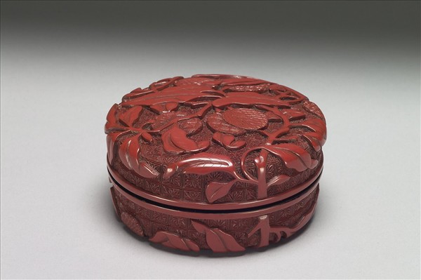 蔗段式盒,子母口,平底,盒內髹黑漆,盒身與盒蓋均飾相同的折枝荔枝。枝幹偏右側佈局,再轉折向左,二顆果實正好位於畫面中央,其餘的果實則掩映在葉間。枝幹的轉折雖自然,然果實具重量感,向背多變,富自然意趣,荔枝表殼特殊的紋理,成為工藝表現的焦點,或斜挖,或菱格細雕,與錦地融合下,彷彿背景中有著數不盡的果實身影。長而大的葉片對比出荔枝的圓巧可愛。漆色紅潤,漆層尚稱堅實,刀法純熟,物象幹廓線柔軟,工藝細巧,打磨不多。