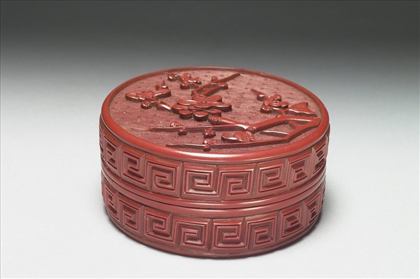剔紅漆盒,蔗段式平頂直壁。蓋頂雕折技梅花橫斜,襯以細密的平行回紋錦地。周壁斜刀雕成規整的回紋。漆堅厚,色棗紅,漆層近底處有一道黑漆痕。全器著手沈重,恐非木胎。明清文人喜愛以剔紅為香盒。《遵生八牋》有謂:「香合,用剔紅蔗段鎮錫胎者以盛黃黑香餅。」或即指此類器。梅花則是香盒常用的裝飾圖案之一,如屠隆「香箋」列有「宋剔梅花蔗段盒」,康熙三十二年(1693)蘇州織造李煦進物單上列有「雕漆梅花香盒」。而本件香盒上繪畫小景似的構圖,也是晚明清初其他器物上常見的裝飾風格。