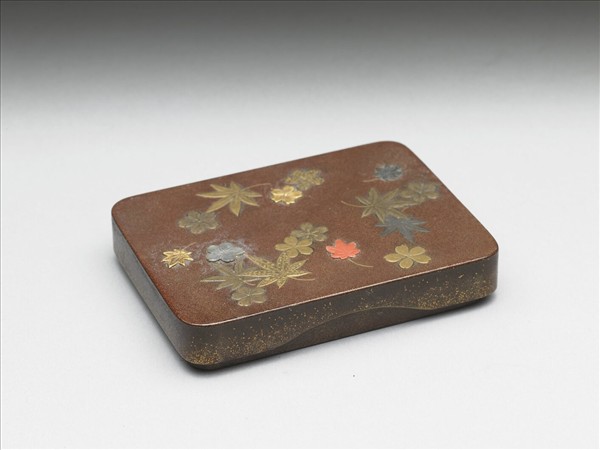 盒內放對數表冊頁。盒蓋鑲嵌珊瑚、金等不同材質的櫻花及楓葉。花葉分佈或聚或散,佈局從容,在褐漆梨地上,猶如飄港泥地上的花葉,秋意正濃。器內梨地,器外底梨地,漆色透明,透露出木紋。