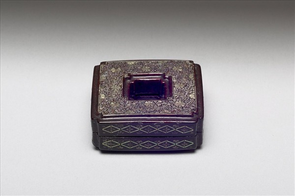 方形小盒,子母口,蓋與器約相等,四角內委,中央有方孔使盒呈現如環形收納空間。全器髹黑漆,紫黑光亮,蓋面與器身以螺甸嵌飾連枝花卉與菱格朵花,盒內綴金箔。內儲有碧玉、碧璽、青金等諸色寶石所作吉祥八寶。本件收入乾隆時期製作多寶格「集瓊藻」中,據集瓊藻小冊所載原有二層七十三件,共儲於嵌飾獸骨螺甸的木箱中。
