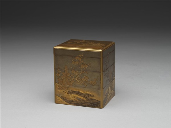 盒面轉角修二倒角,使盒面如浮出盒身,器形隆重。沃懸地研出蒔繪和高蒔繪並呈,土坡上松樹間一梅斜伸而出,樹下流水湍湍,技法嚴謹華麗。四側面構圖相連,器底及器內為梨地,最下層器內加一金屬內裏。
