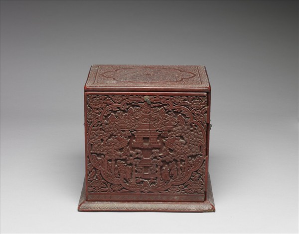剔紅長方形漆盒,抽拉式蓋。蓋面花形開光內剔紅屋宇林園之景,並有高士優遊其間。開光外則飾花葉紋。和外壁四面裝飾類同,皆是在花形開光內剔紅雙龍,開光外飾番蓮花葉。盒座飾蓮瓣紋。盒內隔為四層九格,每格皆有屜,屜外戧金龍紋,每屜內各裝一件書畫作品。
