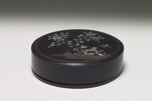 黑漆圓盒,胎薄,盒蓋以螺鈿作牡丹蜻蜓圖飾。外圍一圈連續如意形紋,圓內作牡丹花卉,地平線下以細碎的螺鈿表現土壤,右側兩顆石頭後面長著兩株牡丹,微曲的枝幹,對生的掌狀葉相互錯落,在枝幹末稍各綻放著一朵盛開的牡丹,花叢下一簇簇圓形小花,一旁蜻蜓正彎身下降,一派春天的景致。螺鈿薄,顏色多彩,做工精細。