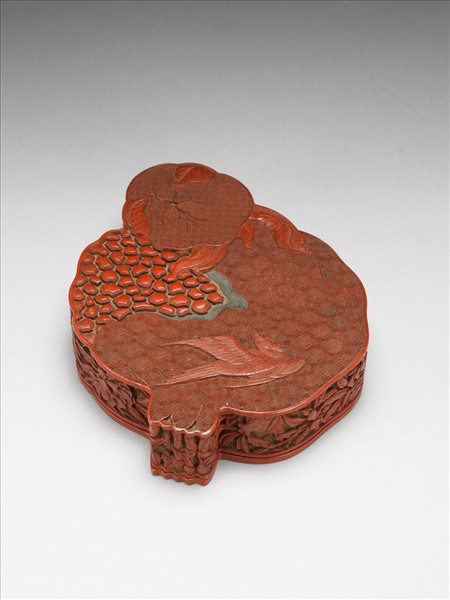 器內作黑漆,器底髹紅漆。以石榴為造型,上側另加一個瓜形,襯以兩三葉片,造型巧妙。側面飾折枝石榴,兼具寫實與裝飾的美感。瓜形作雙錢形錦地,石榴左側開裂,邊緣灰漆斜現,露出粒粒分明的果實,石榴作龜形花式錦地,下側一燕回首,內容豐富。運用不同的錦地製造不同的質感,猶如精緻的絲綢織品。物象描寫精到細膩,是乾隆朝中的佳作。