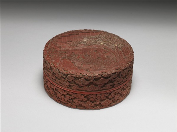 蔗段式盒,內髹黑漆,盒蓋以不同錦地紋區分畫面,前刻一排山石,左右各有一棵松樹,二老者與一童子立於菱格紋地上,一老者手持如意,童子手捧一盆栽;中段為山形紋錦地,兩側刻有坡石,後方為回折紋錦地,前有一山丘,後有數雲朵。周圍有蝙蝠祥雲紋,連續延伸至蓋側與盒外壁。底飾一圈回紋,中央無紋。內附一木座,有存放五件玉器之座槽,貯故玉4479。