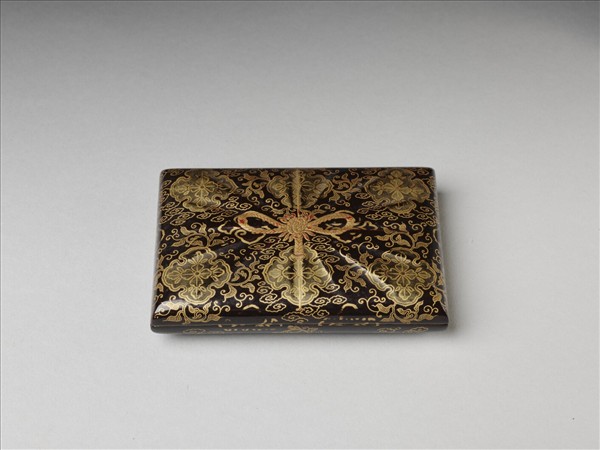 在紫檀多寶格內,盒內裝洋畫片。黑漆地平蒔繪菱花、唐草紋,圖案內或蒔粉,質感細膩。盒形雖扁,然盒面轉接處成圓弧,器形滑順服手。盒面如包袱般淺浮雕皺摺,中央高蒔繪一繩結。